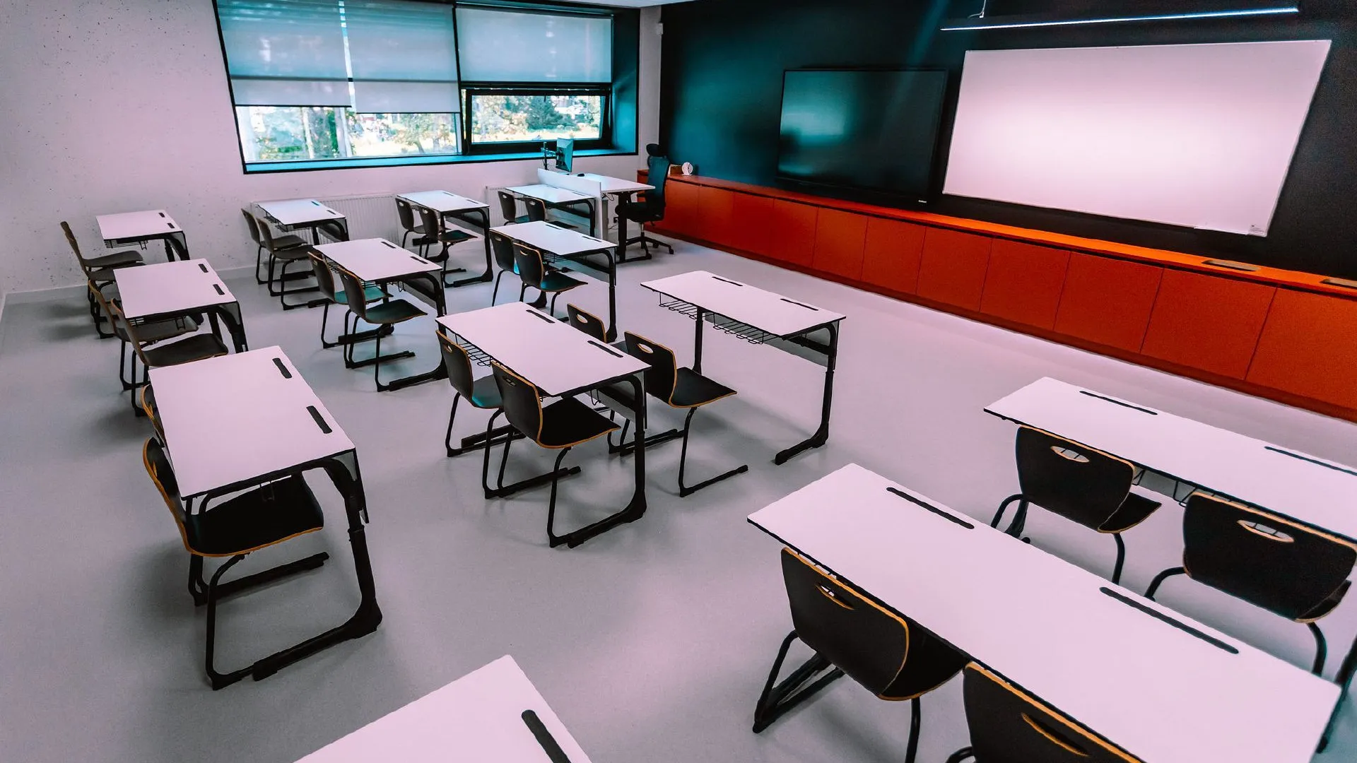 Mācību klašu, gaiteņu un personāla telpām sienu krāsošanai izmantota netonēta Vivacolor Acrylate Matt krāsa. Tā ir matēta (spīduma klase 7), mitrumizturīga ūdens bāzes krāsa iekšdarbiem. Tai ir teicama adhēzija ar iepriekš krāsotām virsmām. Krāsotai virsmai ir īpaši augsta izturība pret mitru berzi, un tādēļ tā ir piemērota vietām, kur nepieciešama augsta izturība pret nodilumu un mitrumu. Melnas sienas, kas ēkai piešķir modernu un zinātnisku noskaņu, krāsotas ar Vivacolor Wall 7 un Tikkurila Luja 7 krāsām Y499 tonī. Vivacolor Wall 7 ir matēta, pret tīrīšanu noturīga ūdens bāzes krāsa iekšdarbiem. Krāsai ir laba adhēzija un ļoti laba segtspēja. Tā ir piemērota piekrāsošanai, viegli uzklājama, nepil un nešļakstās. Sienu krāsošanai izmantots arī piesātināti sarkanais L412 tonis. Griesti baltā tonī krāsoti ar Vivacolor Ceiling 3 krāsu, savukārt melnie griesti apstrādāti ar Vivacolor Wall 7 iekšdarbu krāsu.